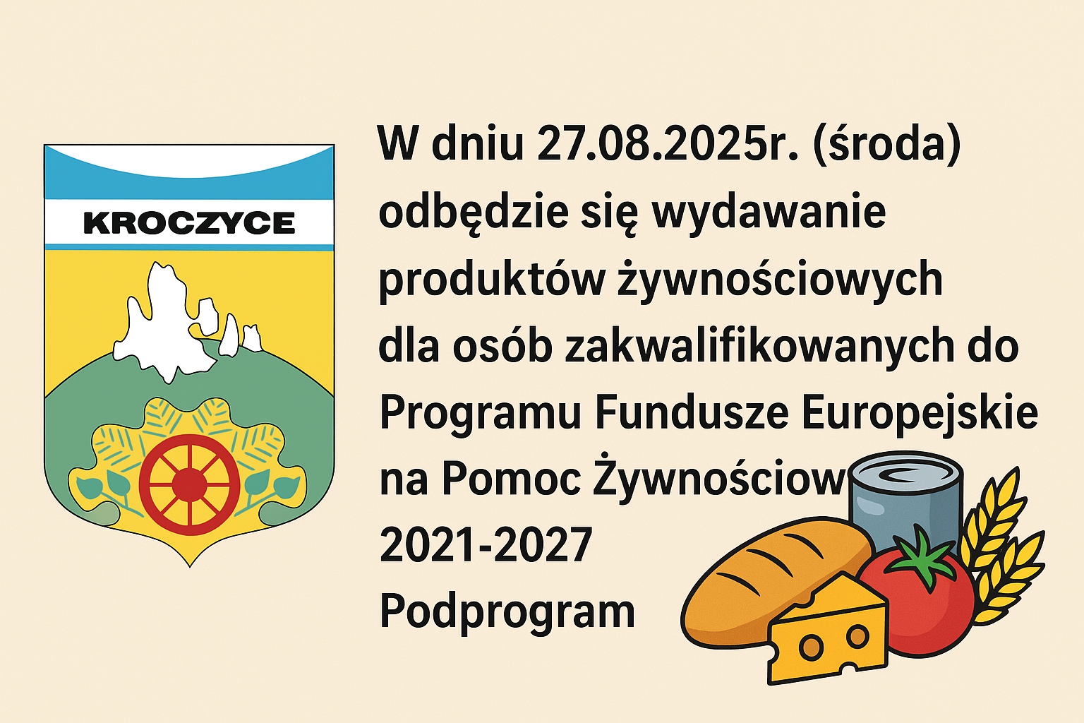 Gminny Ośrodek Pomocy Społecznej w Kroczycach informuje, że w dniu 27.08.2025r. (środa) odbędzie się wydawanie produktów żywnościowych dla osób zakwalifikowanych do Programu Fundusze Europejskie na Pomoc Żywnościową 2021-2027 Podprogram 2024 współfinansowany ze środków Europejskiego Funduszu Społecznego Plus.